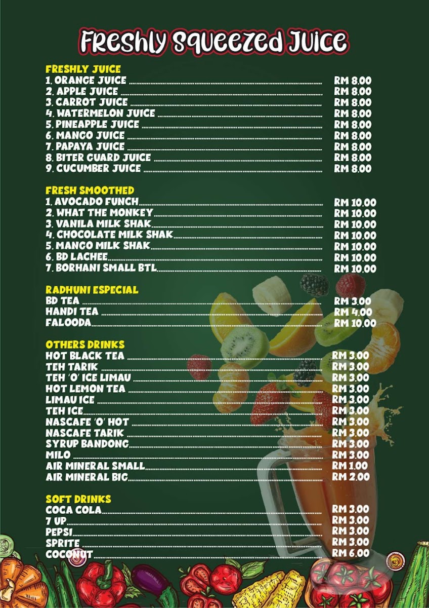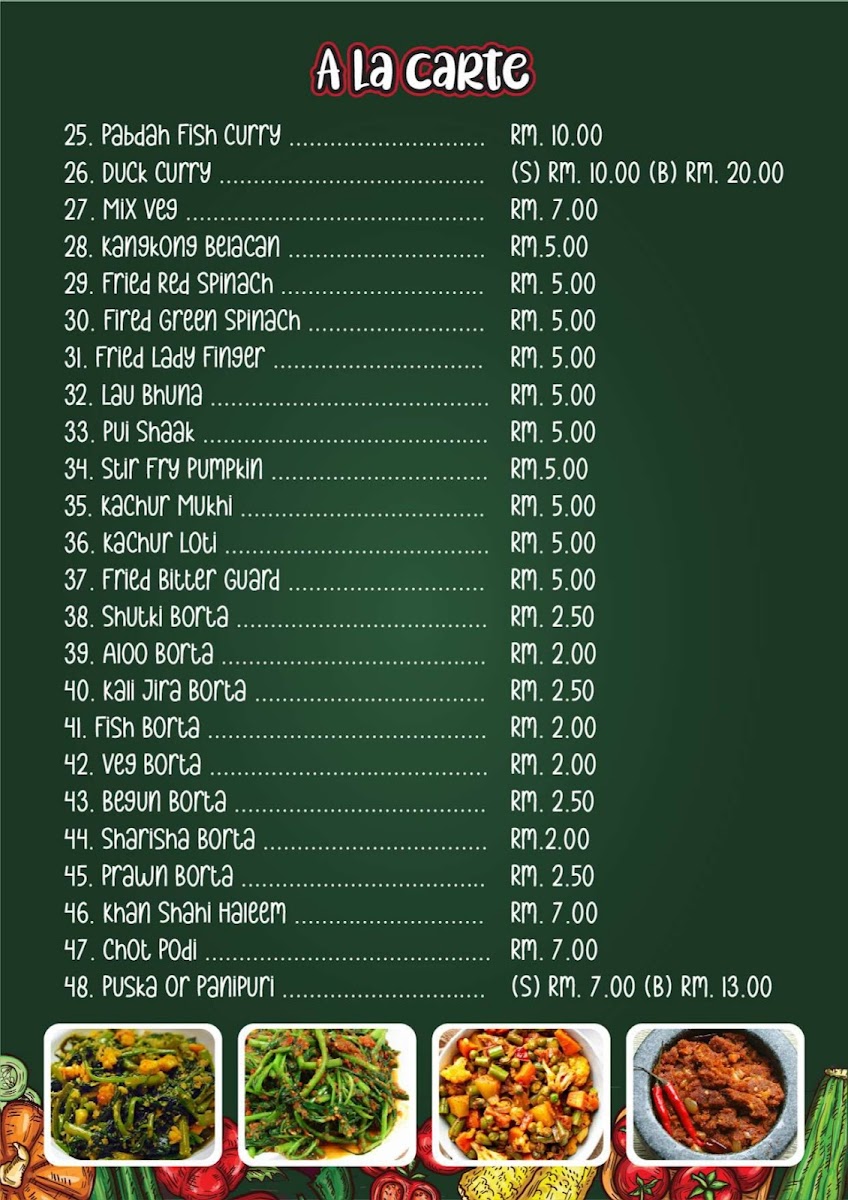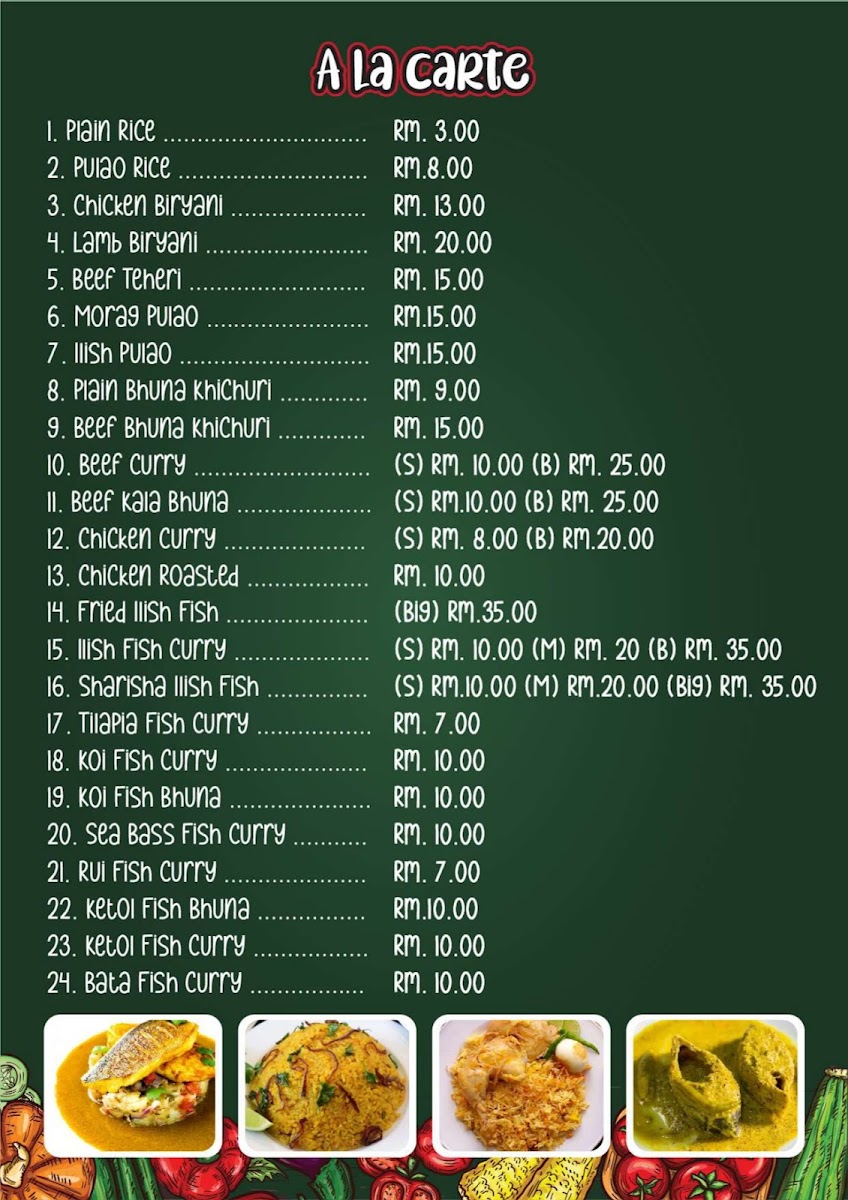 Radhuni Bilash Restaurant & Grill offers a diverse menu that caters to a wide range of tastes, from hearty meat dishes to refreshing beverages. For those craving a satisfying meal, the A la Carte options include a variety of Beef, Chicken, and Fish dishes, allowing diners to choose their preferred protein. The restaurant also features a Breakfast Menu, perfect for starting the day with a delicious meal. For lunch and dinner, the Lunch & Dinner Set offers well-balanced meals that are both filling and flavorful. Sweet tooths will appreciate the Sank's & Bangladeshi Sweet Items, which bring a delightful end to the meal. The Seafood section provides fresh options for seafood lovers, and to complement any meal, the Freshly Squeezed Juices offer a healthy and refreshing option to quench your thirst. Whether you're in the mood for something light or a full course meal, Radhuni Bilash offers an extensive menu to satisfy any craving.